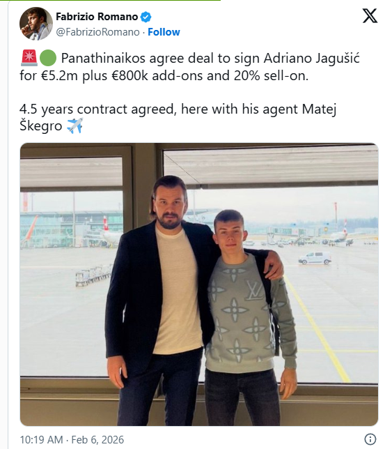 Fabrizio Romano objavio je fotografiju Adriana Jagušića s menadžerom Matejem Škegrom. Romano tvrdi da je Jagušić potpisao ugovor na četiri i pol godine, a da je transfer s bonusima vrijedan šest milijuna eura.